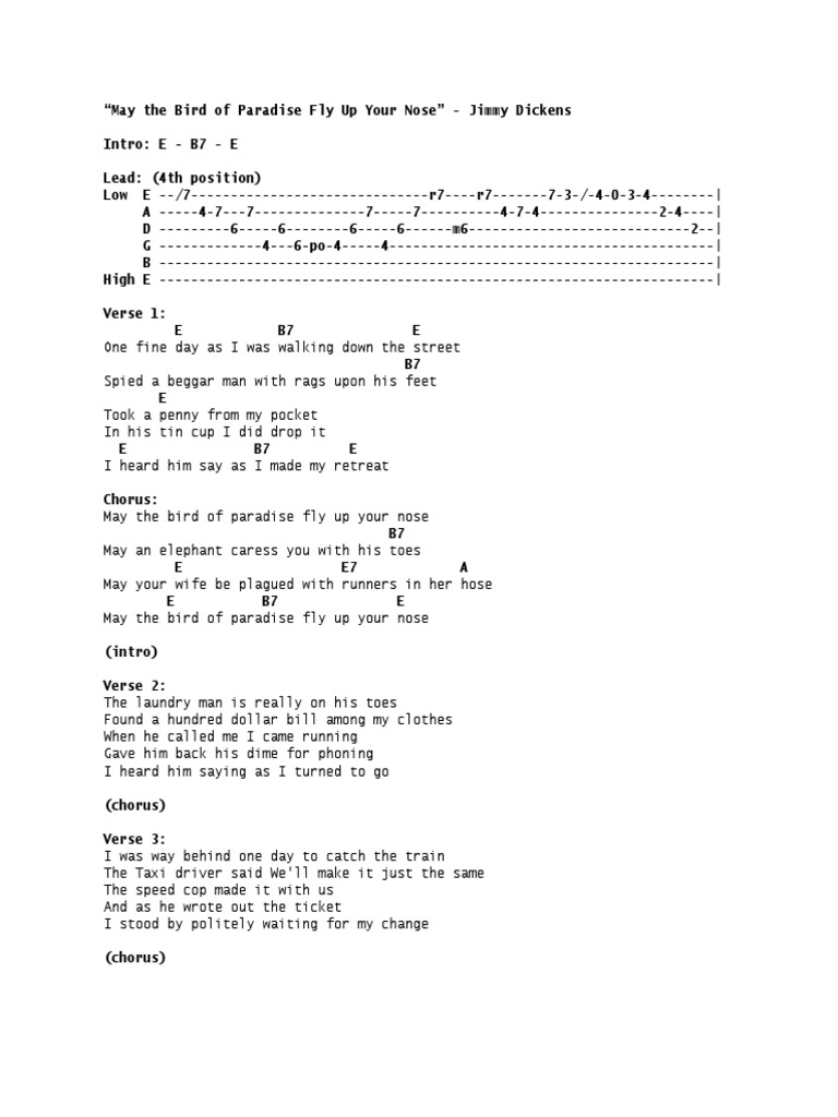 "May the Bird of Paradise Fly up Your Nose" is a 1965 novelty song performed by Little Jimmy Dickens. It was Dickens' most successful single on the U.S. country music chart. It spent two weeks at No. 1 that November, and stayed on the chart for a total of 18 weeks. On the overall Billboard Hot 100 the song peaked at No. 15. It was his only Top 40 hit on the latter chart.